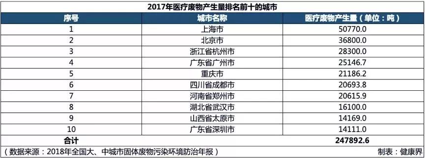 根据环保部发布的《2018年全国大、中城市固体废物污染环境防治年报》数据显示,2017年,202个大、中城市医疗废物产生量78.1万吨,处置量77.9万吨,大部分城市的医疗废物都得到了及时妥善处理。