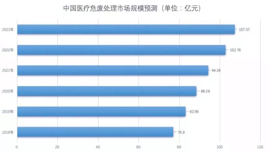 2018年前瞻产业研究根据医疗机构的病床数、病床使用率以及单位病床平均每天产生的医疗废物量估算,中国2018年的医疗废物总产量可能会突破206.01万吨,医疗废物市场规模将达到76.9亿元。到2023年,医疗废物处理市场规模将达到107.37亿元,产量预计达到249.56万吨。
