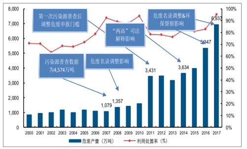 2000-2017年中国危废产量及边际影响因素追溯(万吨)